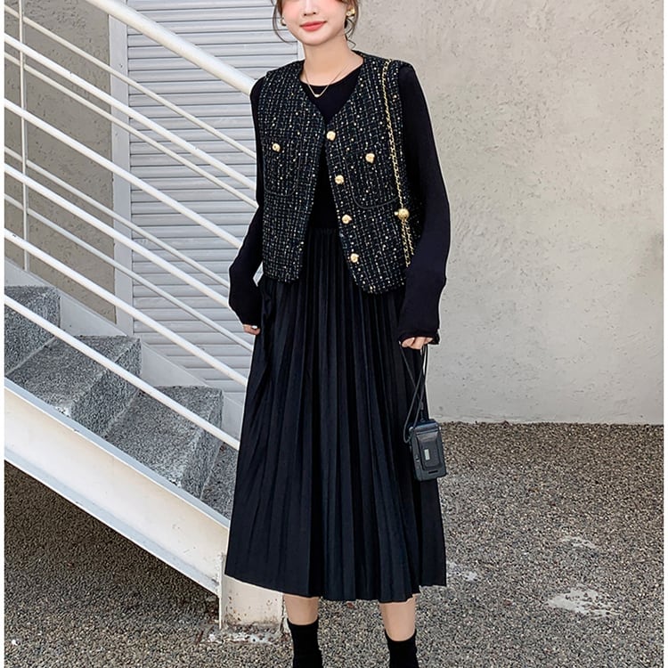 Ribbon collar pleated dress and tweed vest【2set】00054