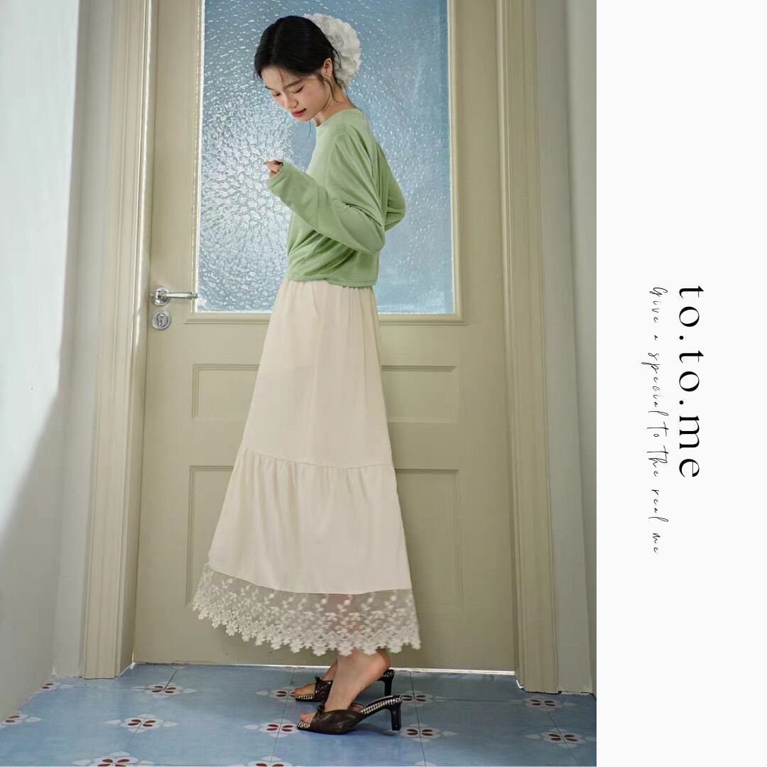 足元のレースが目を惹くワイドレッグパンツ。