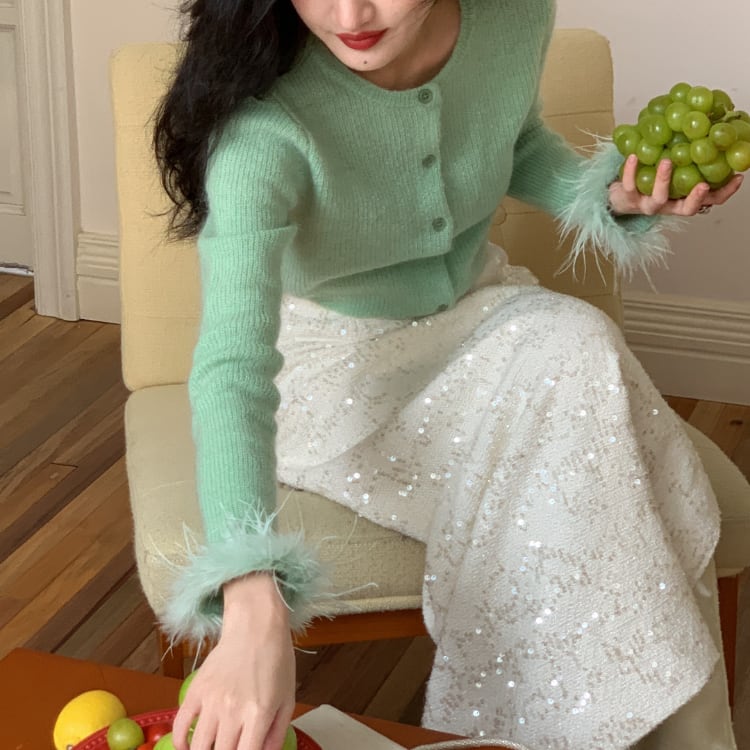 袖のフェザーがアクセントとなり、シンプルなコーディネートに華やかさをプラスします。