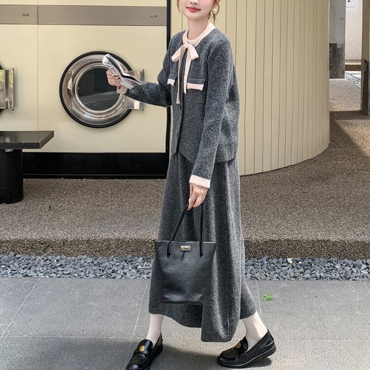 Two-tone ribbon knit cardigan and flared skirt【2set】00194