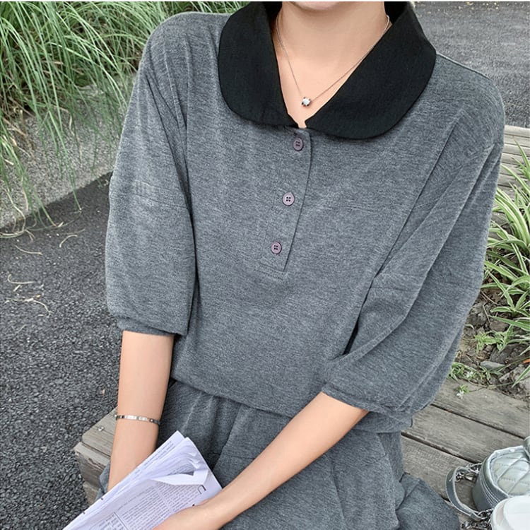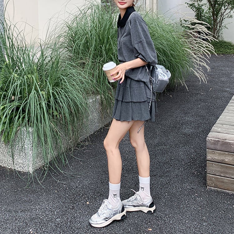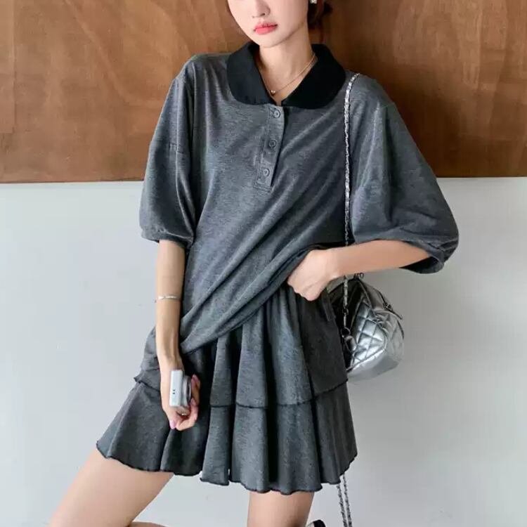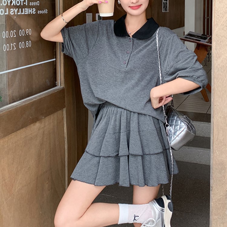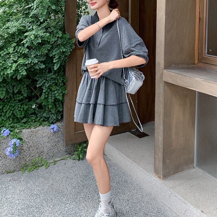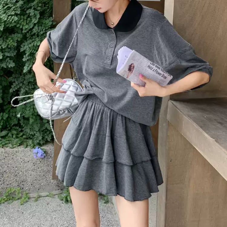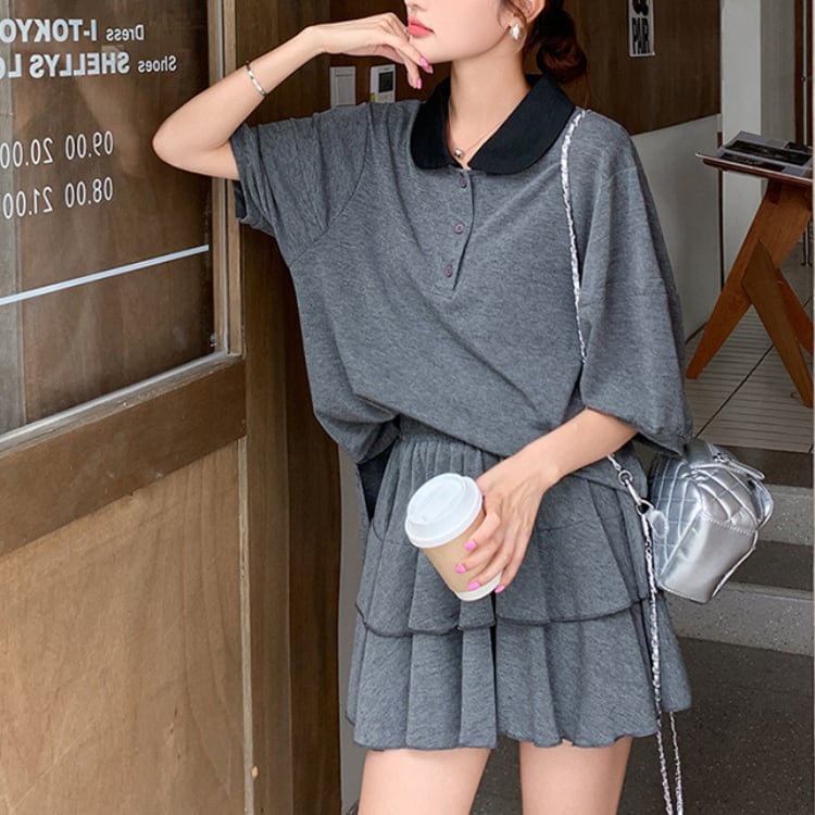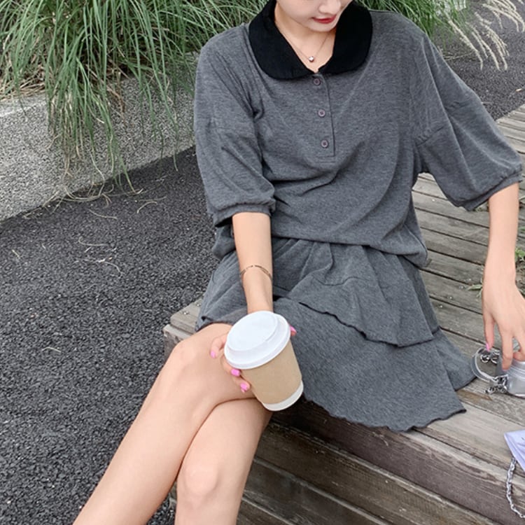 Polo collar top and two-tiered ruffle skirt【2set】00192