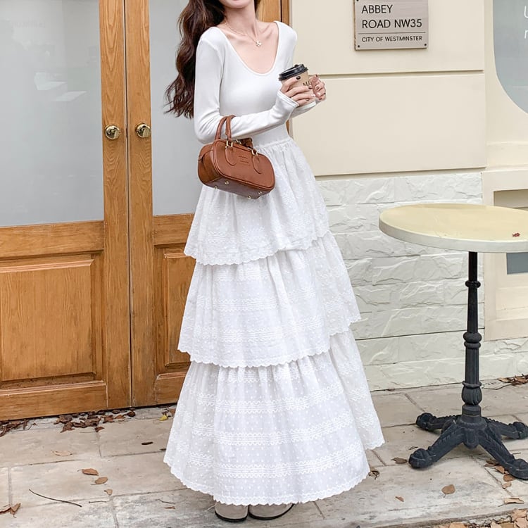 トップス部分はシンプルな長袖で、スカート部分はティアードデザインでふんわりと、メリハリのあるスタイルが完成します。