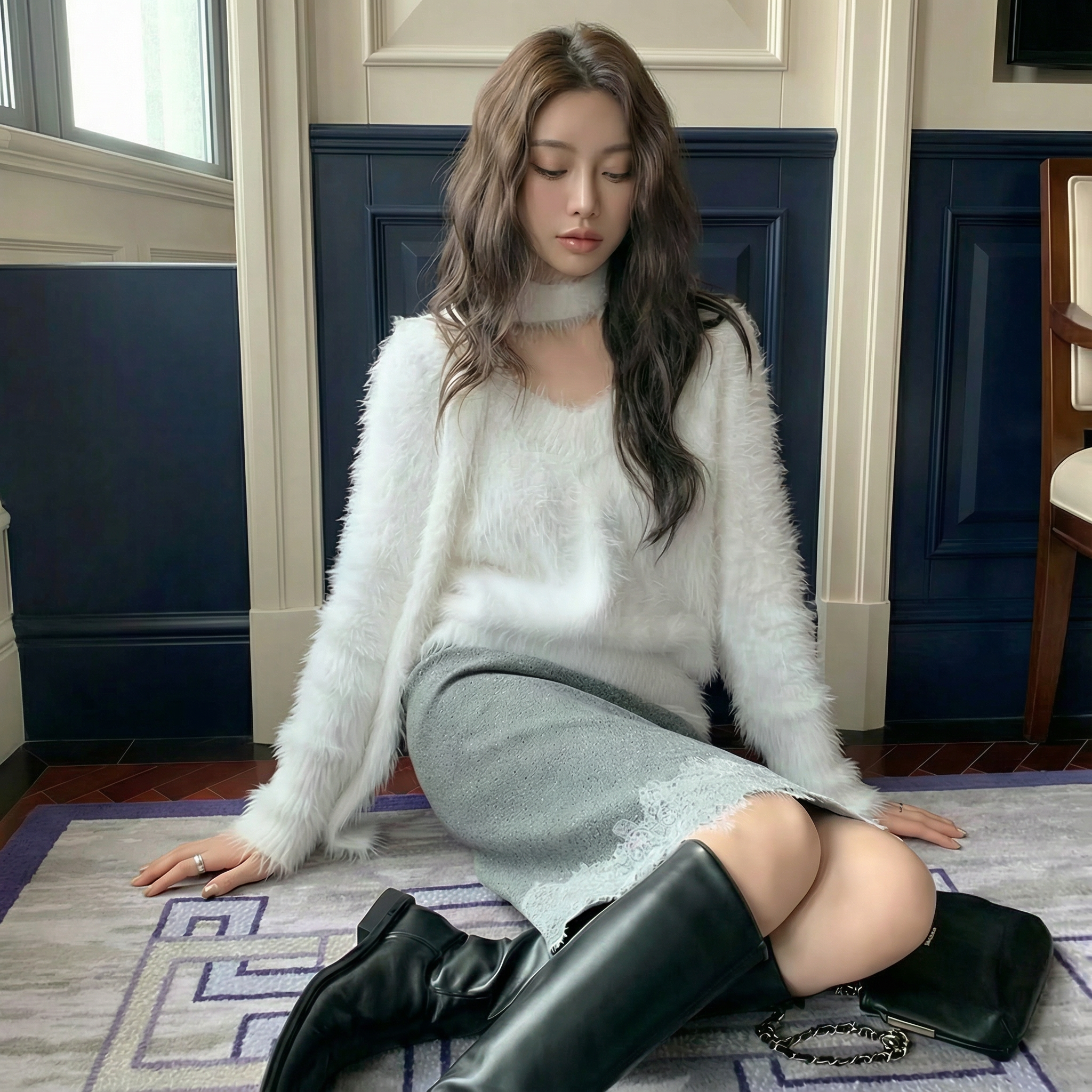 トレンドのチョーカーネックがポイントのニット。