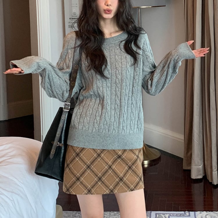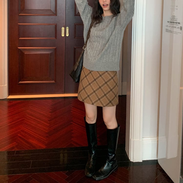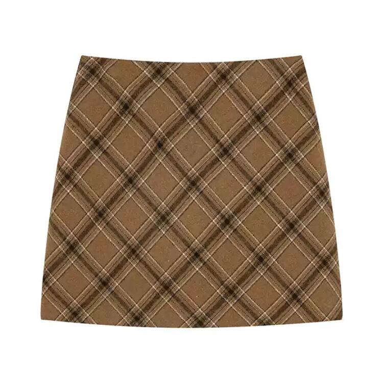 斜めのタータンチェックがアクセントになったキャメルのミニスカート。