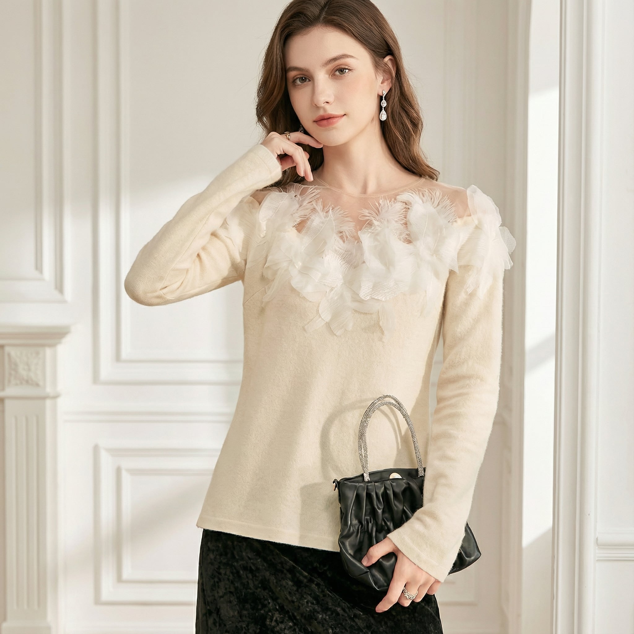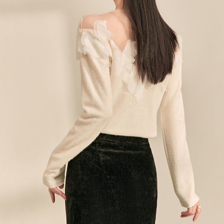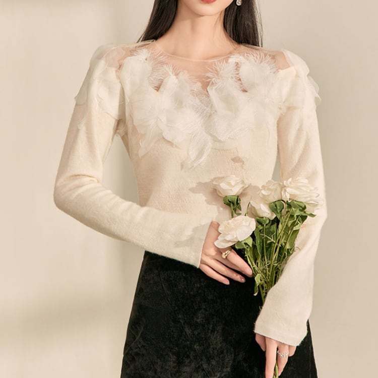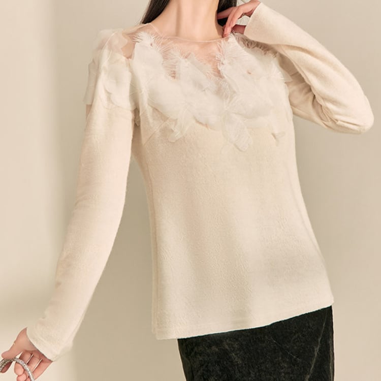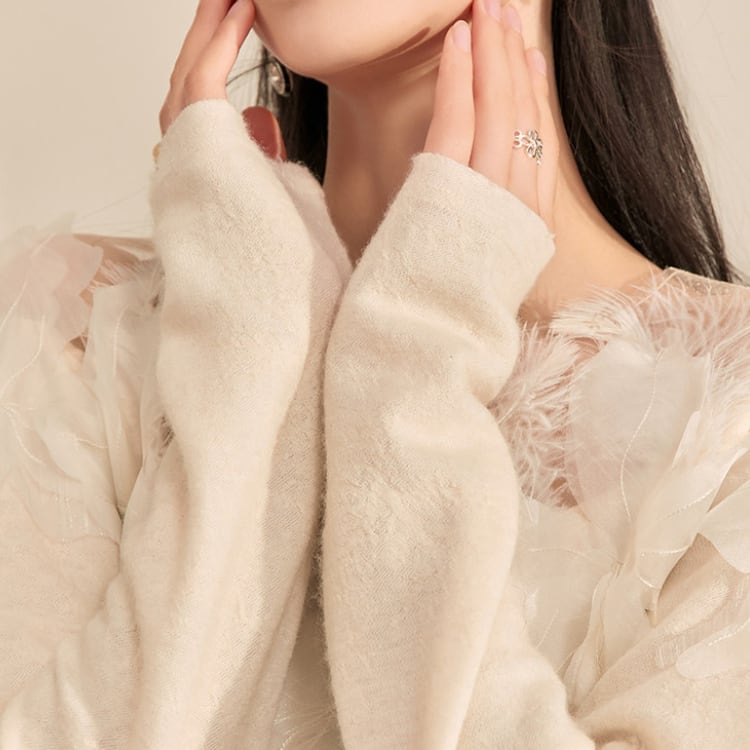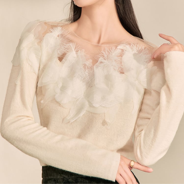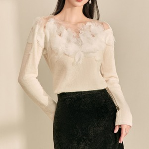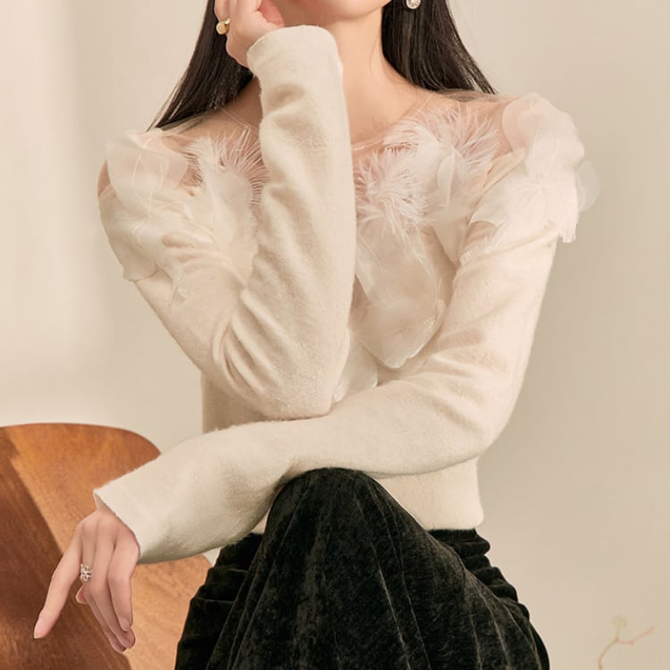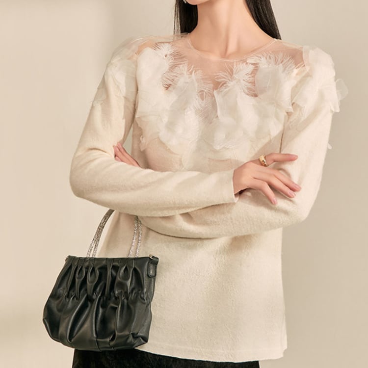 シンプルなクルーネックニットに、フェザー調の装飾を施したシアーな素材を組み合わせることで、上品で華やかな印象に。