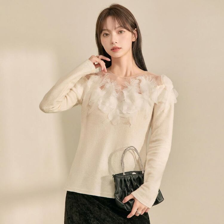 誰にも媚びない”かわいい”を。シンプルなクルーネックニットに、フェザー調の装飾を施したシアーな素材を組み合わせることで、上品で華やかな印象に。
