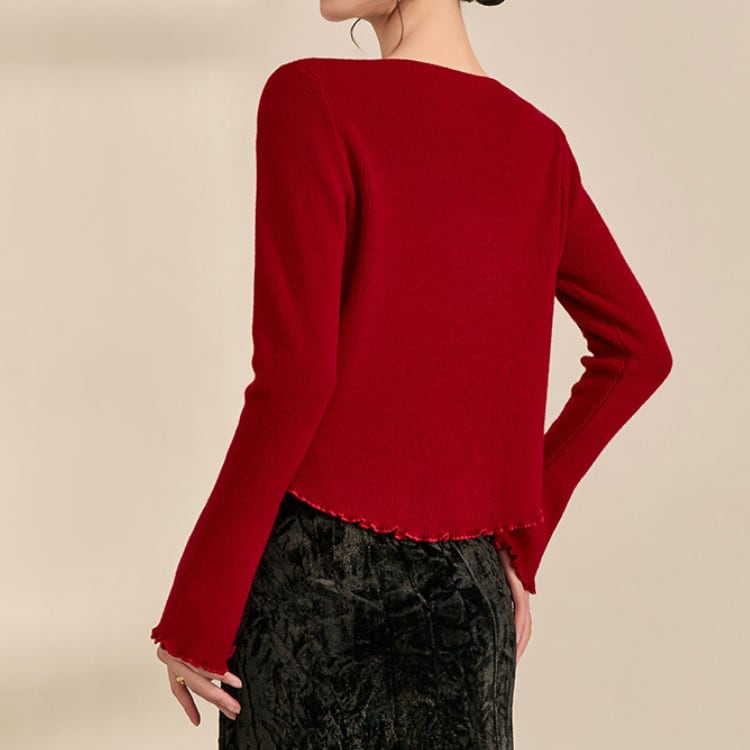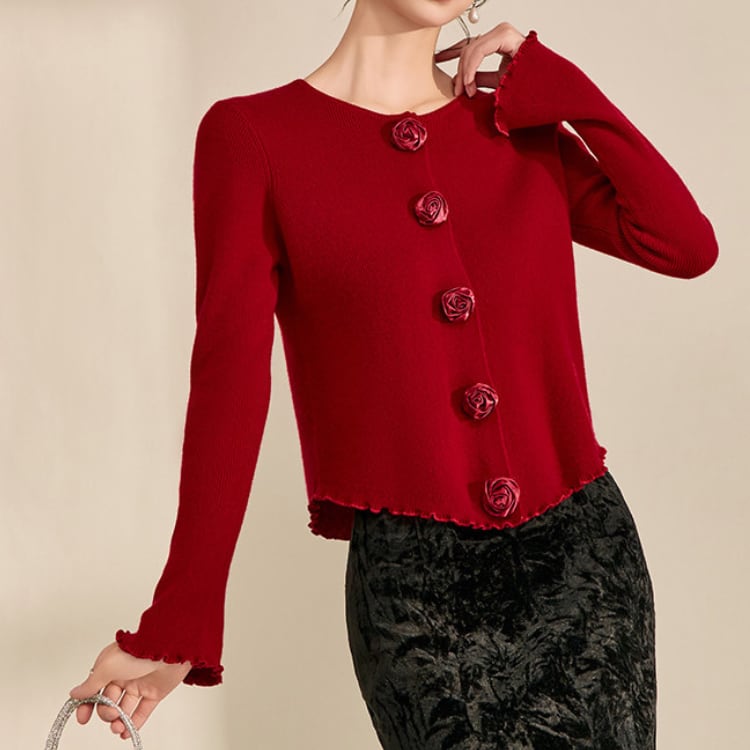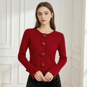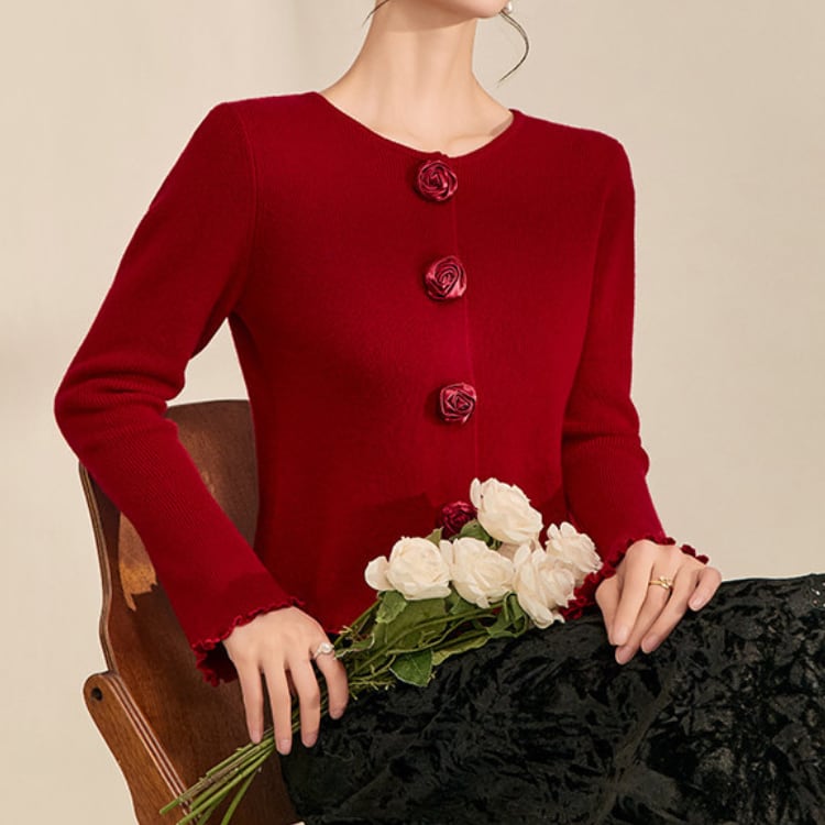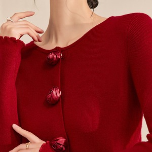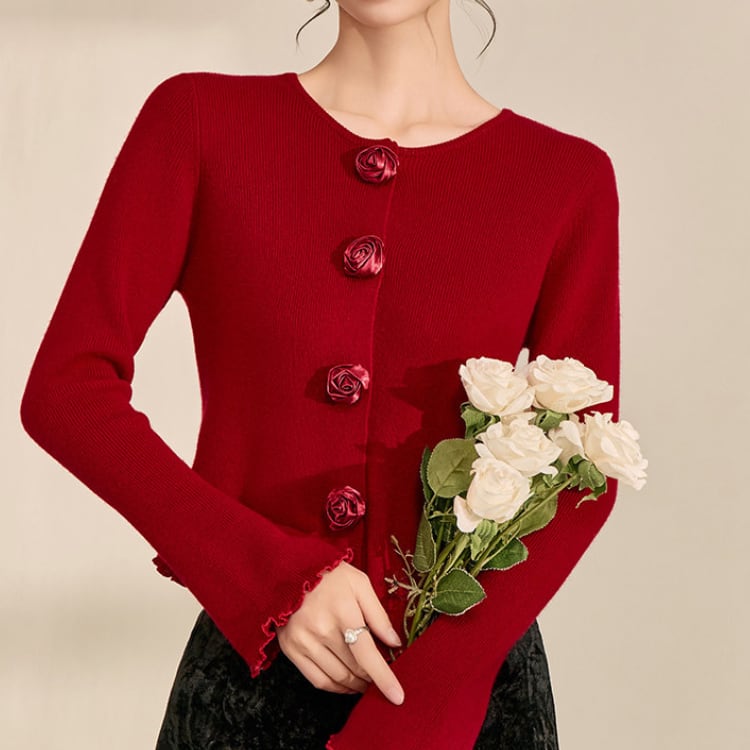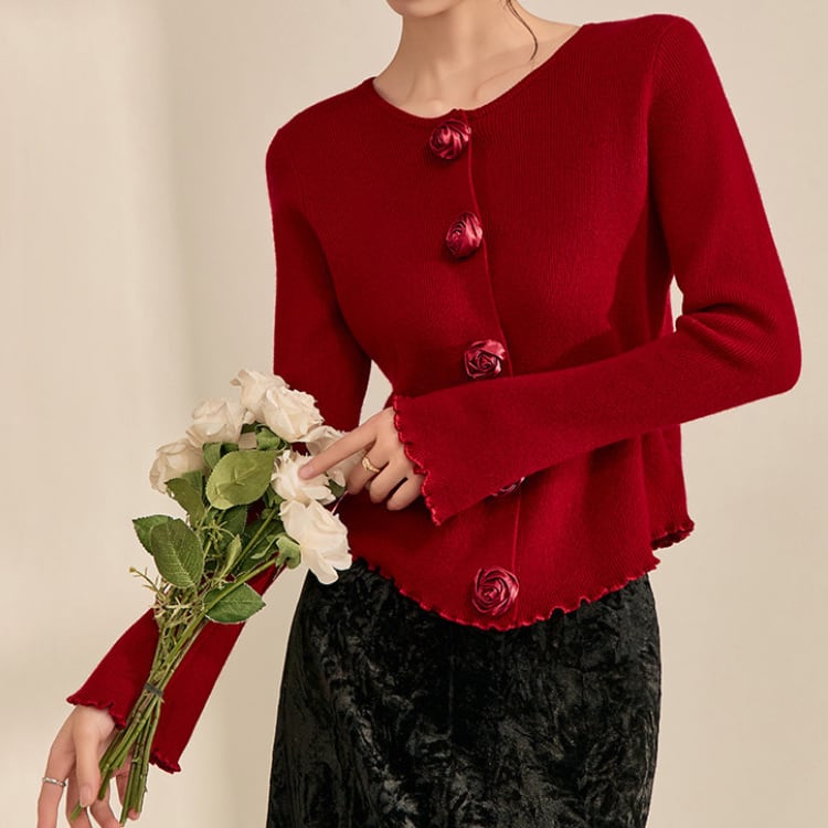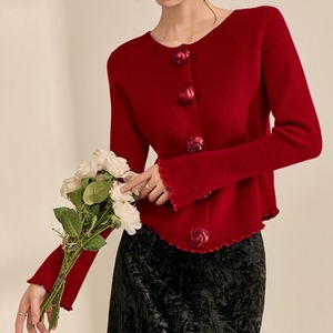 上品な印象のニットカーディガン。特徴的な花柄ボタンが、シンプルなコーディネートに華やかさをプラスします。