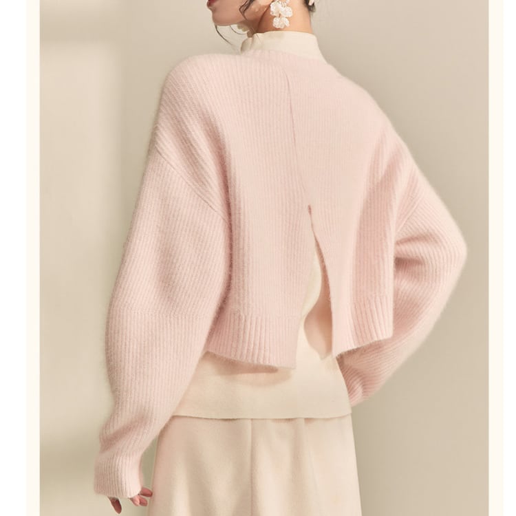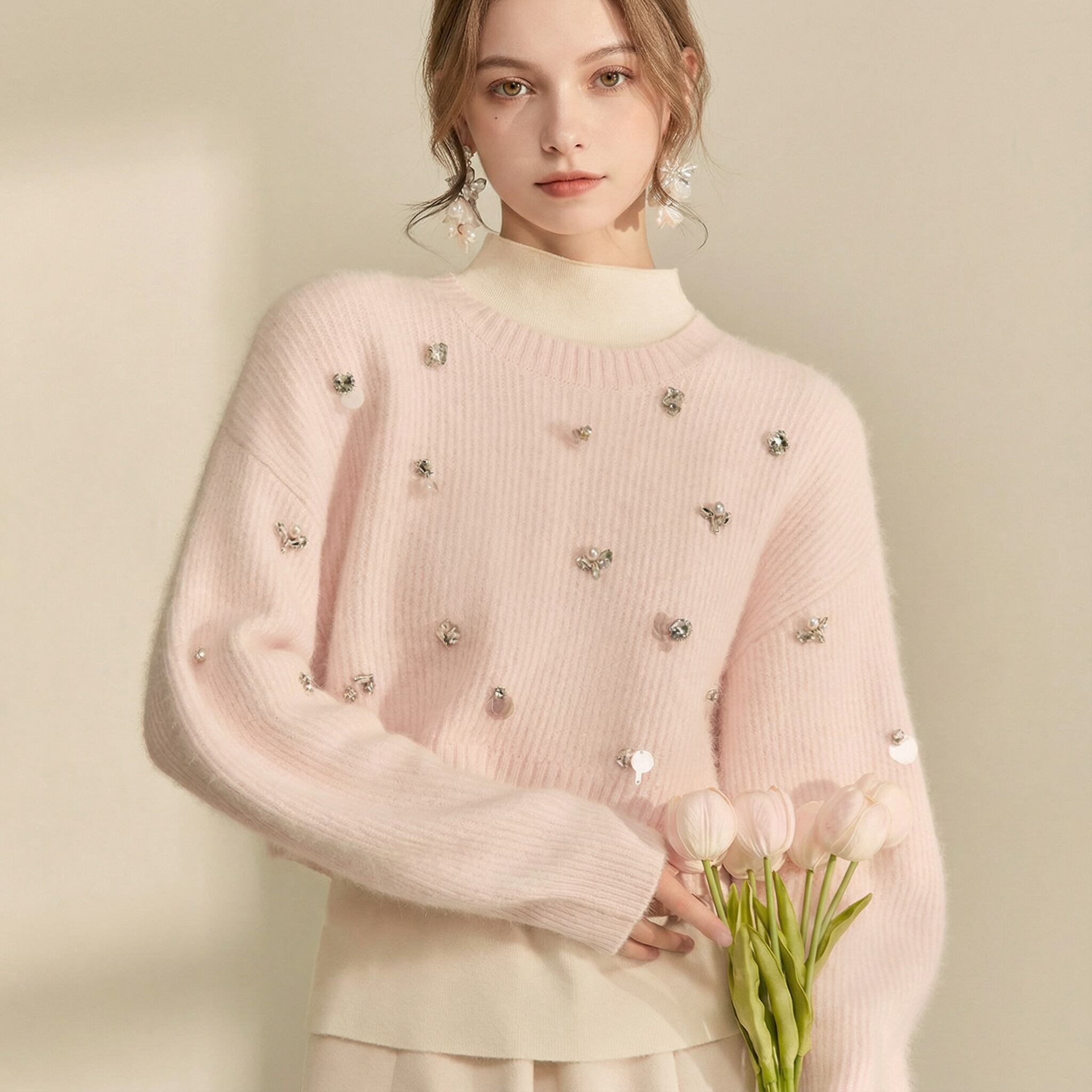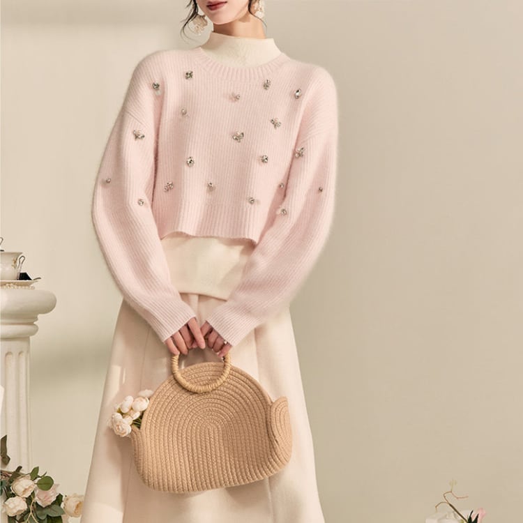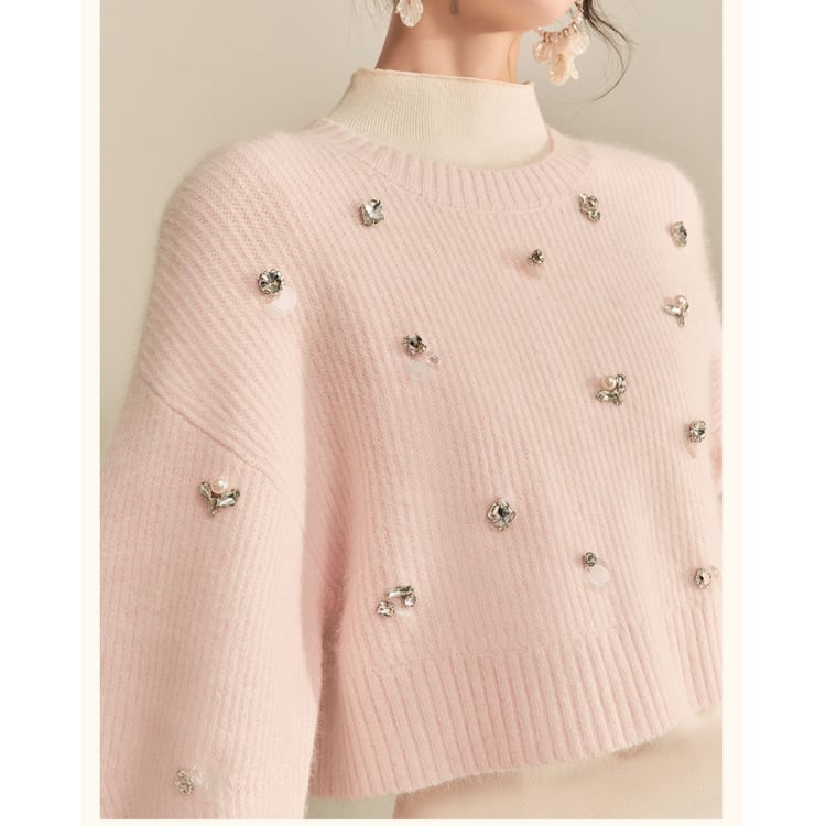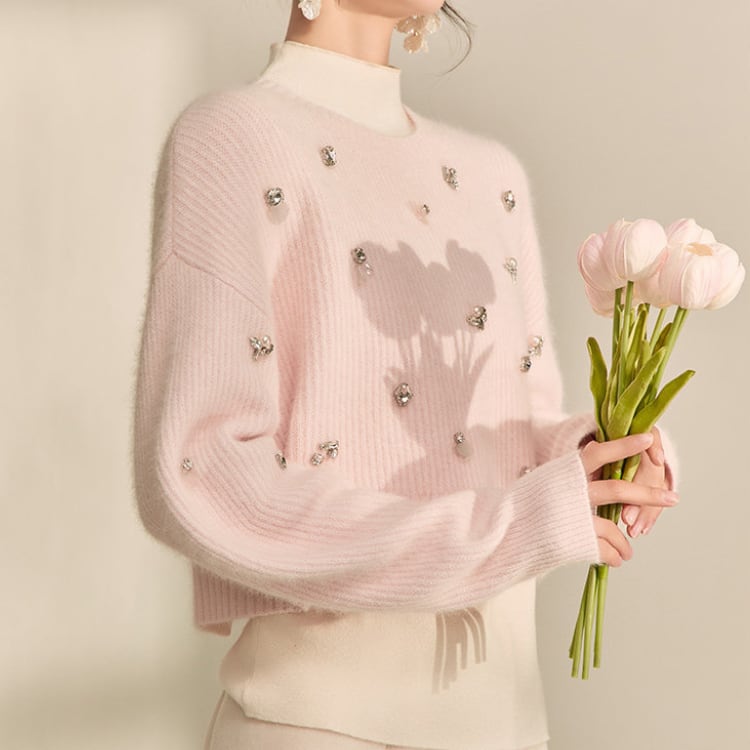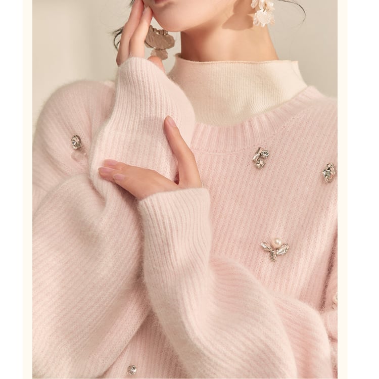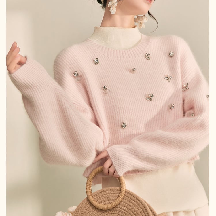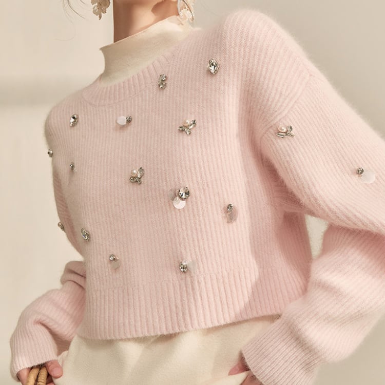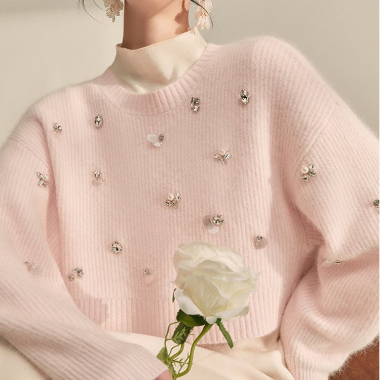 上品なビジューが目を引くニットは、シンプルなデザインながらも存在感を放ちます。