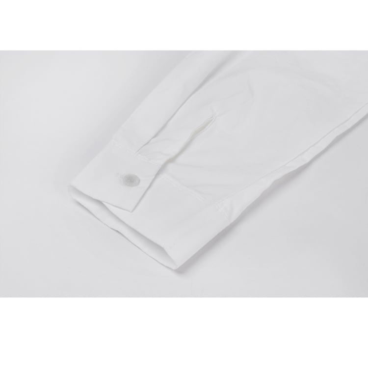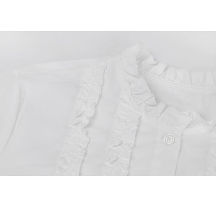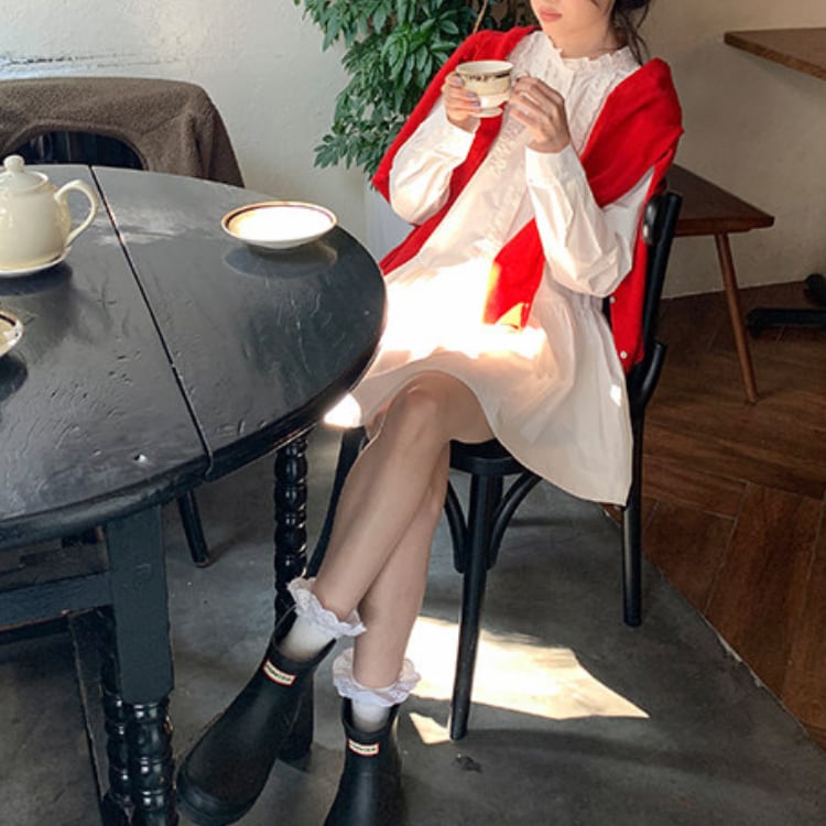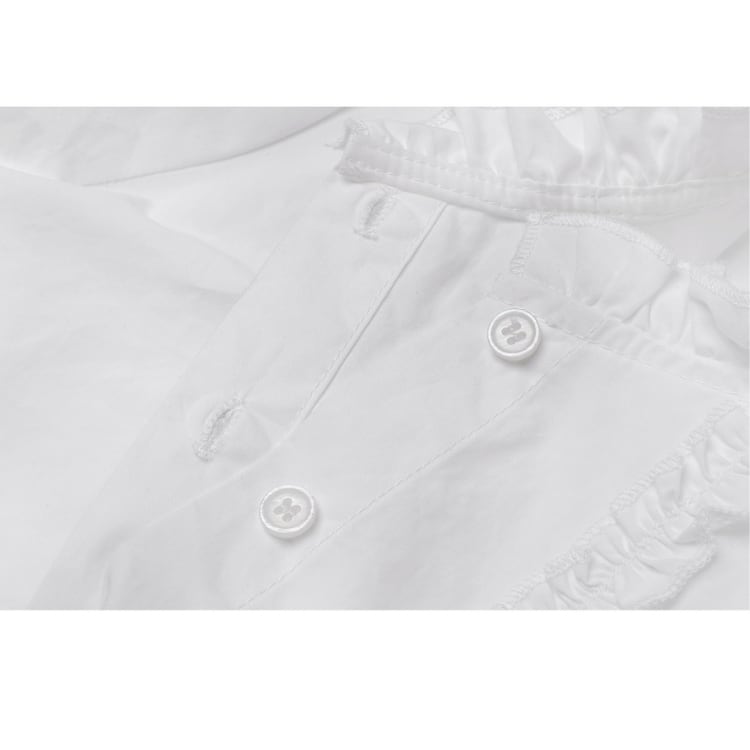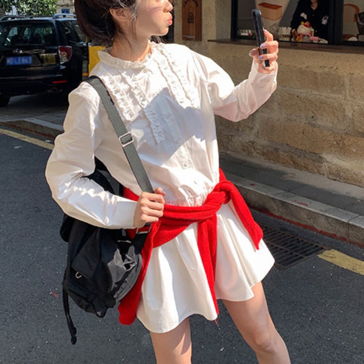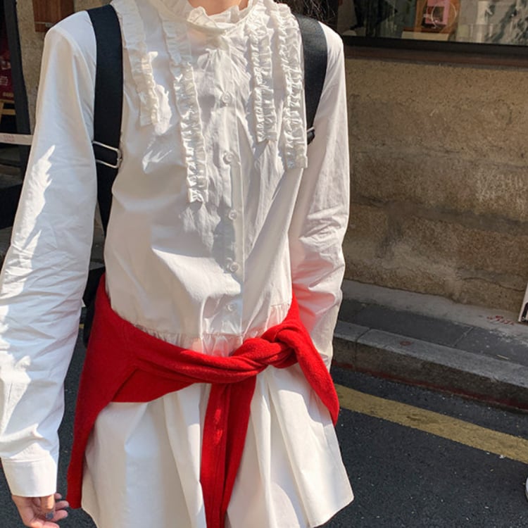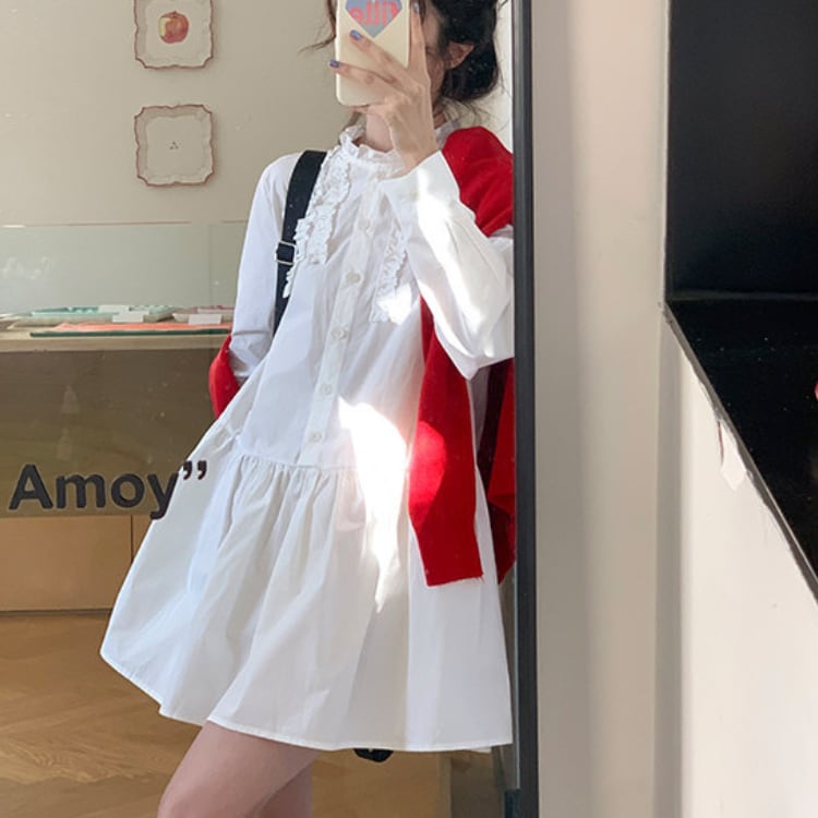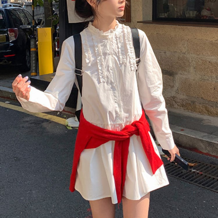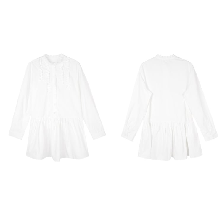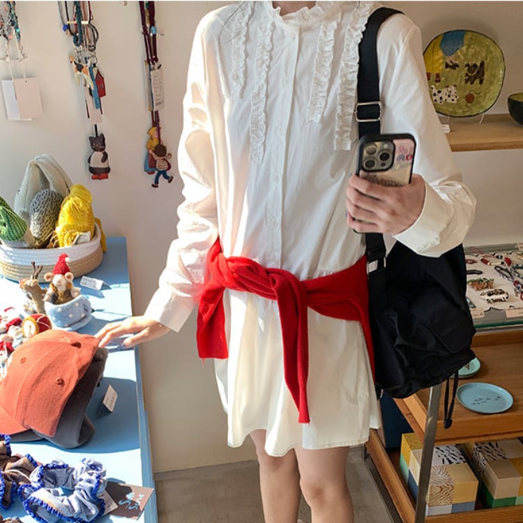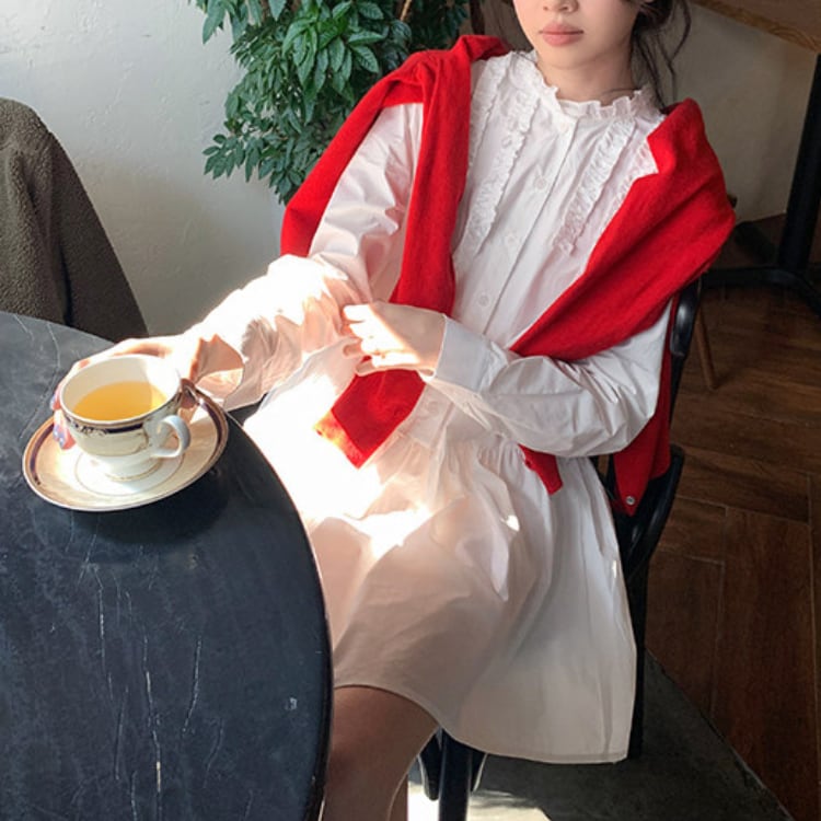 優雅なフリルカラーが特徴のミディ丈シャツドレスです。