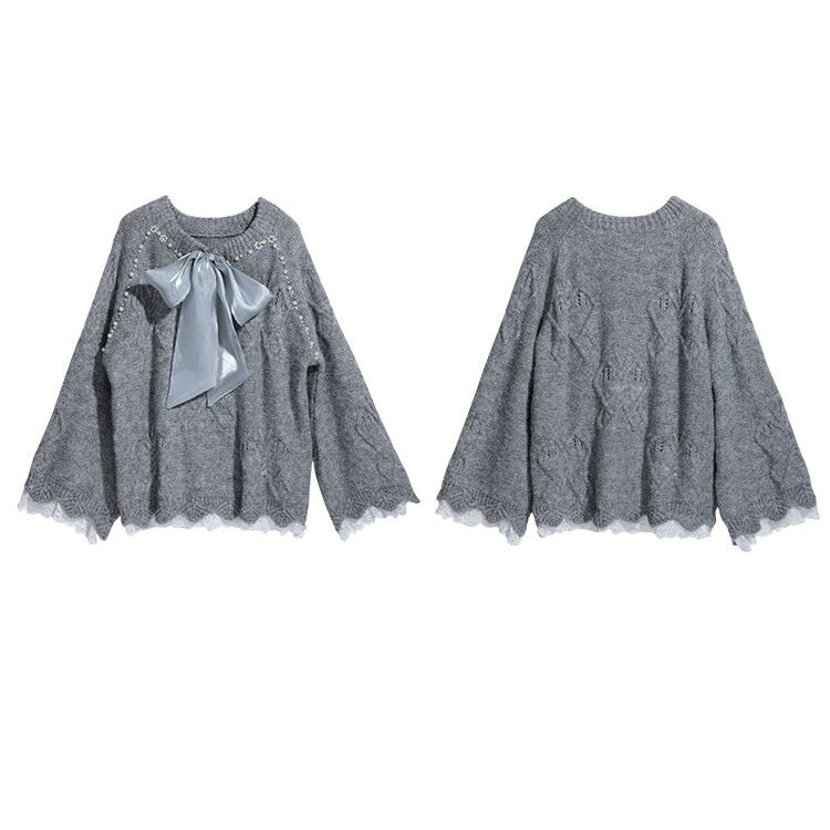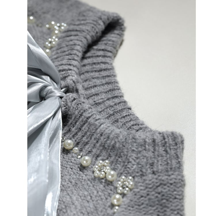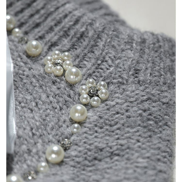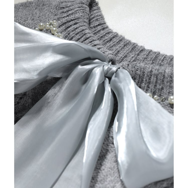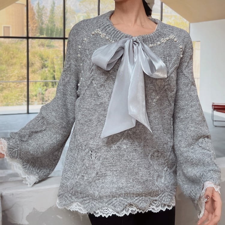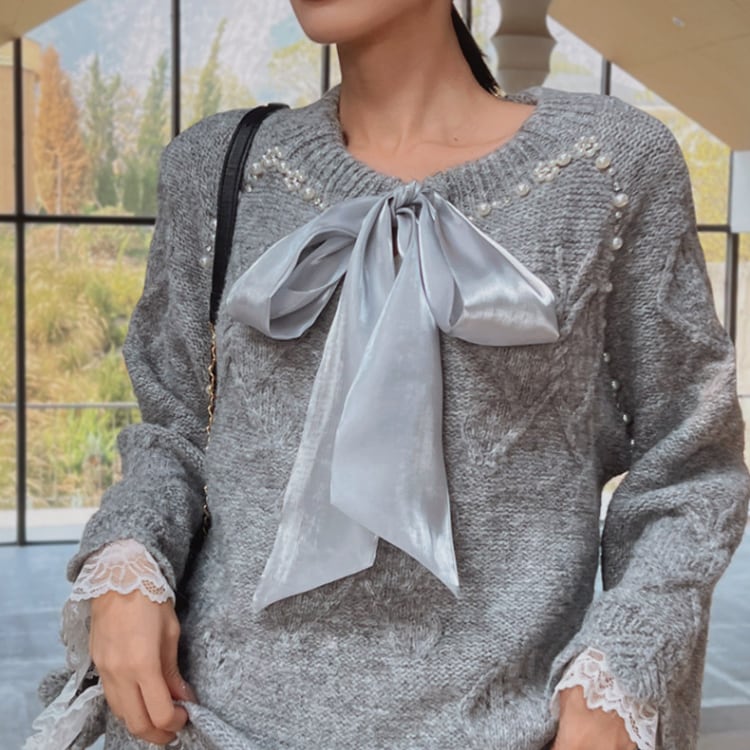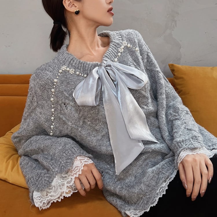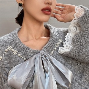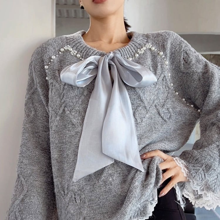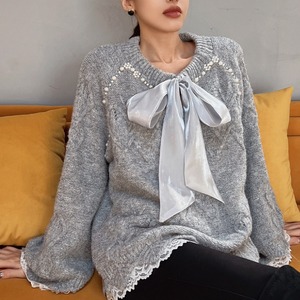 上品なパールとリボンが特徴の長袖ニット。