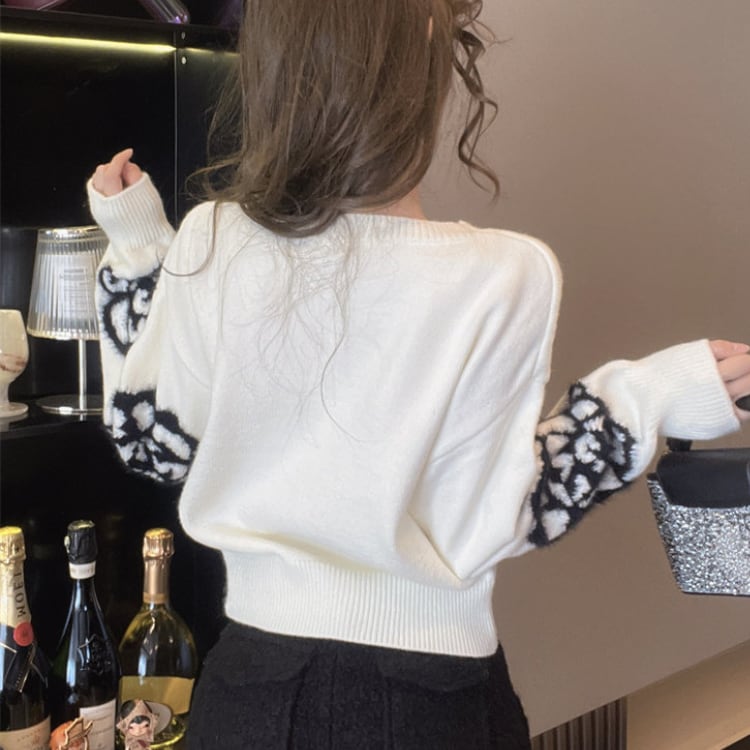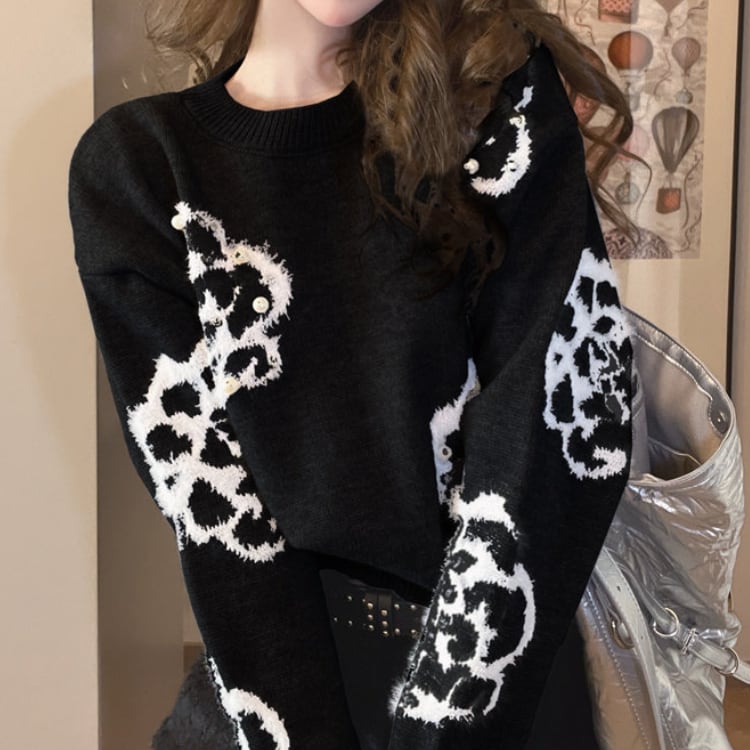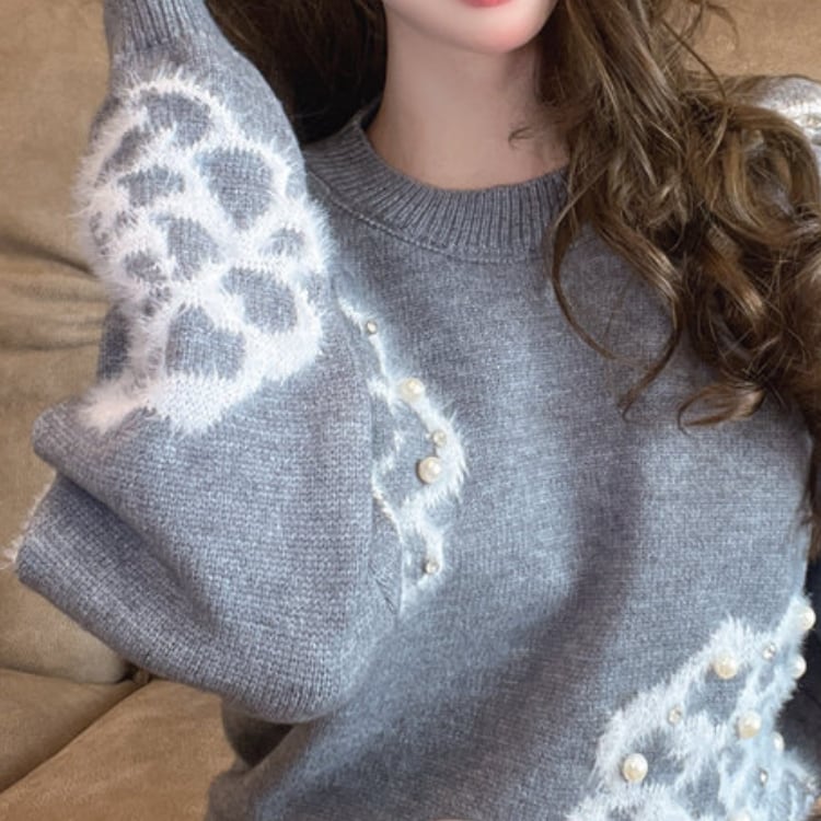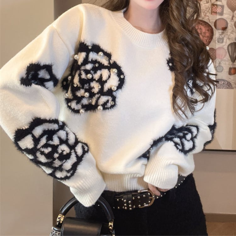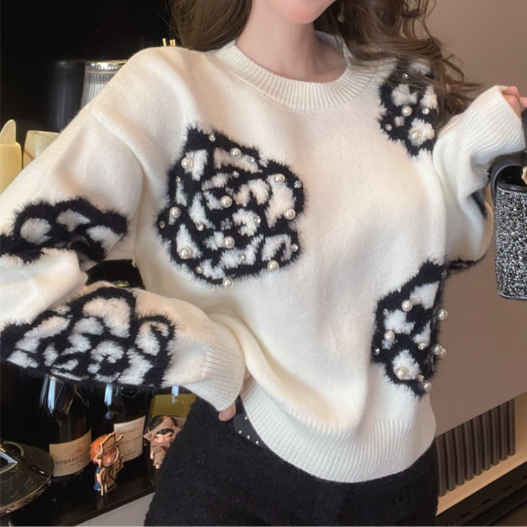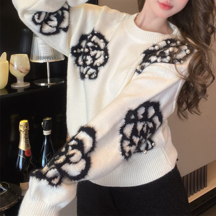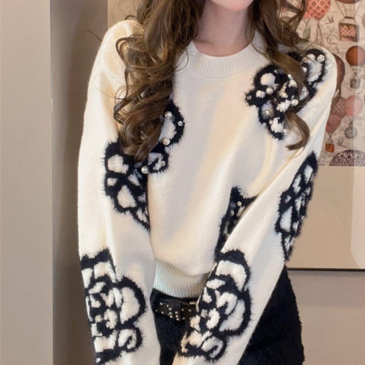 フラワー柄が目を引くニットは、普段のコーディネートに遊び心をプラスします。