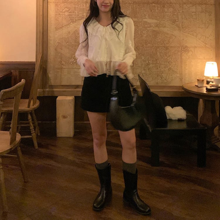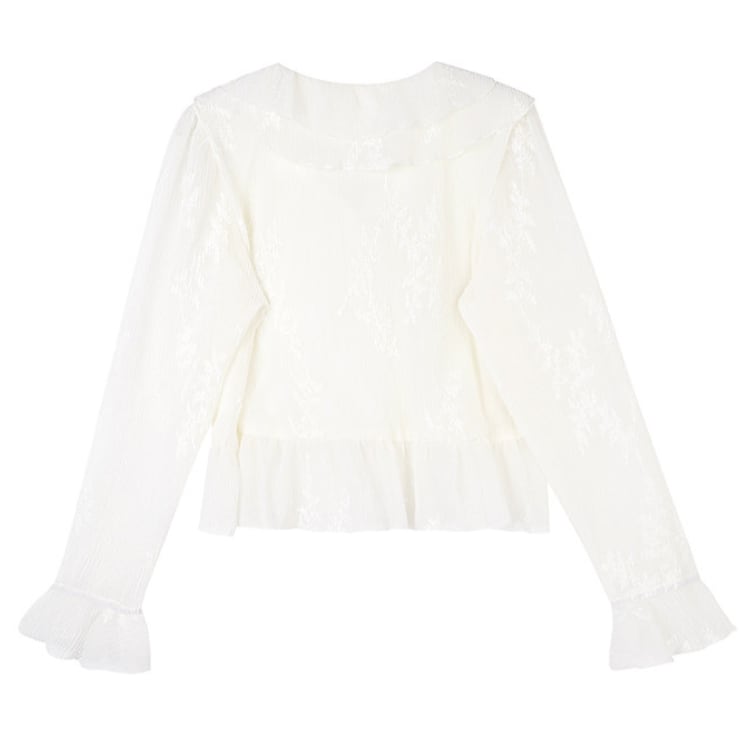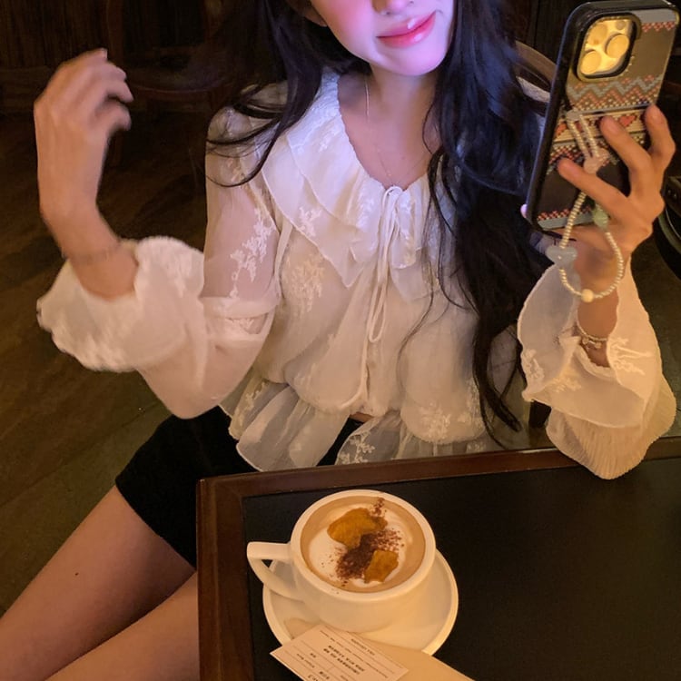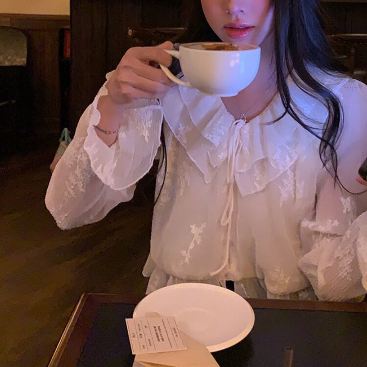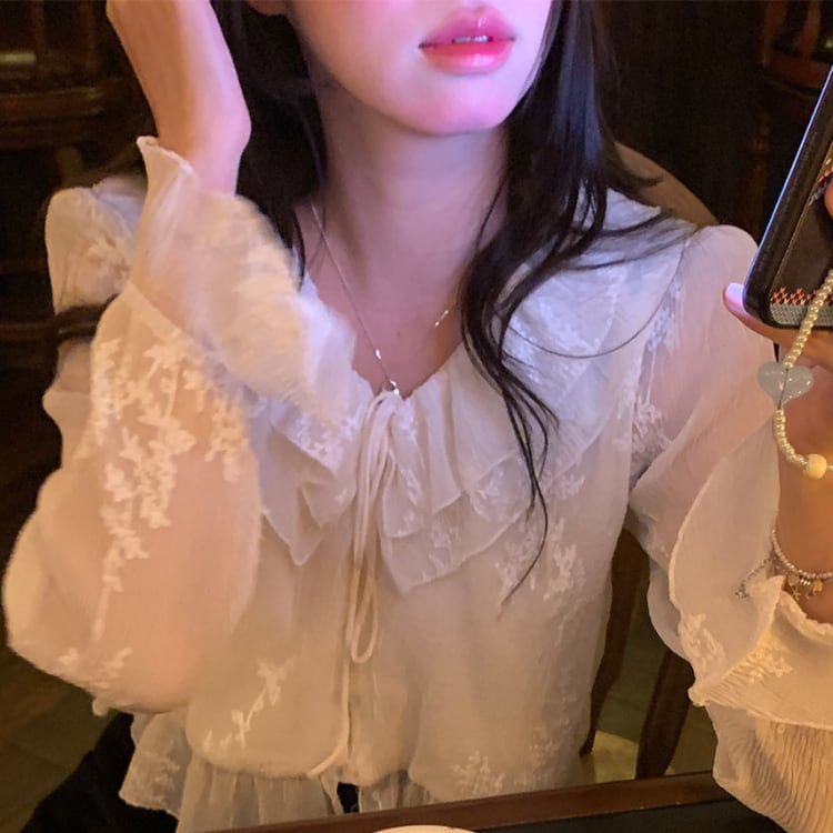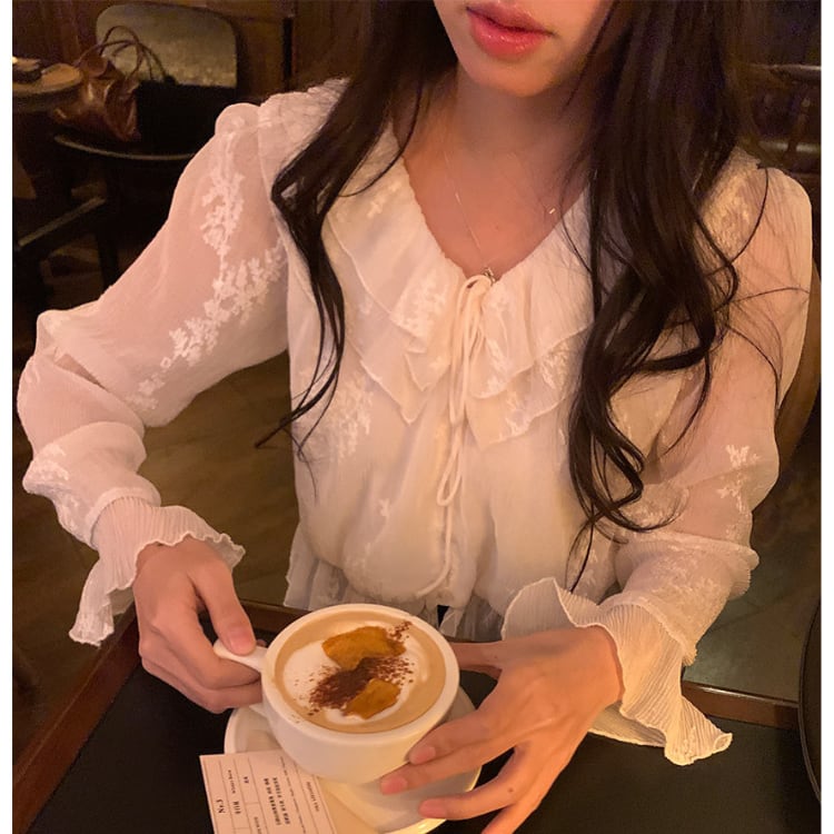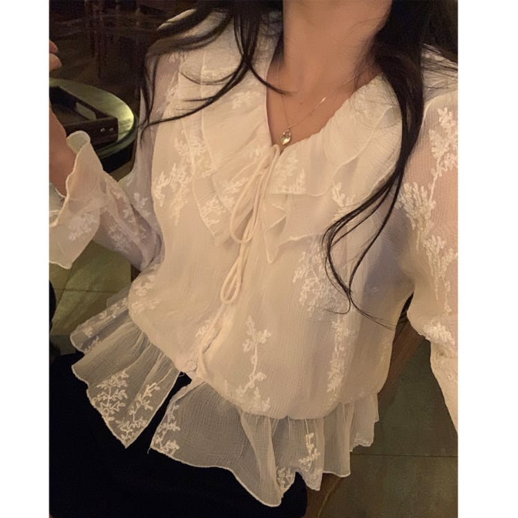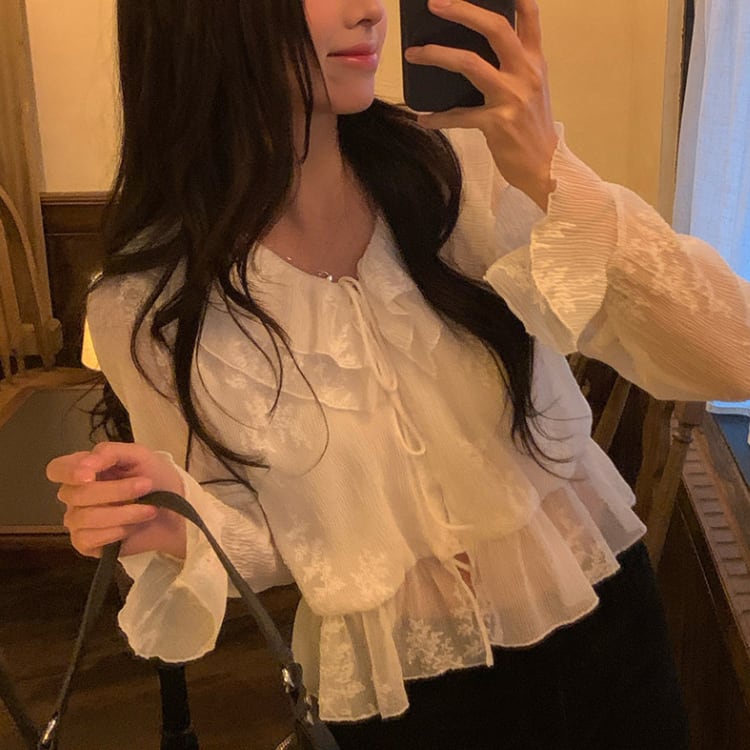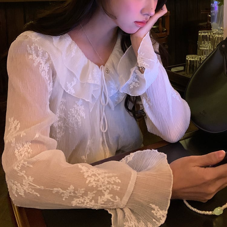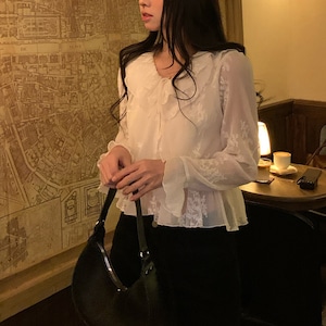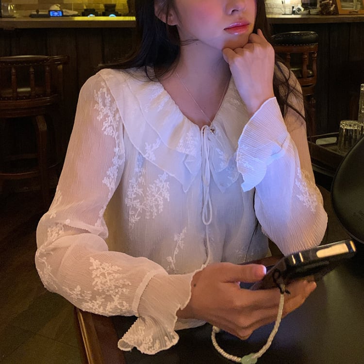 フリルが上品な印象を与え、オフィスやデートなど、様々なシーンで活躍する長袖ブラウス。