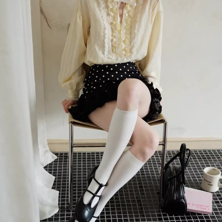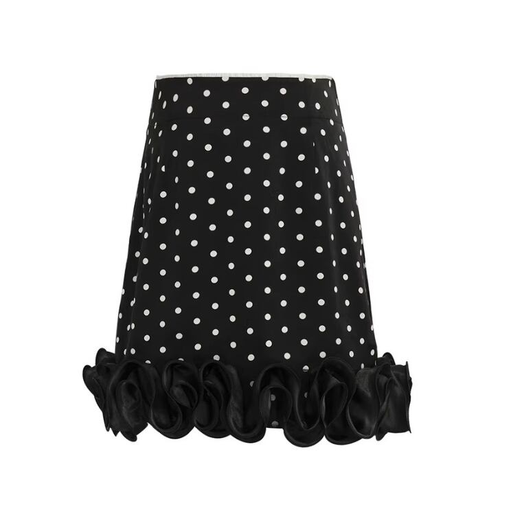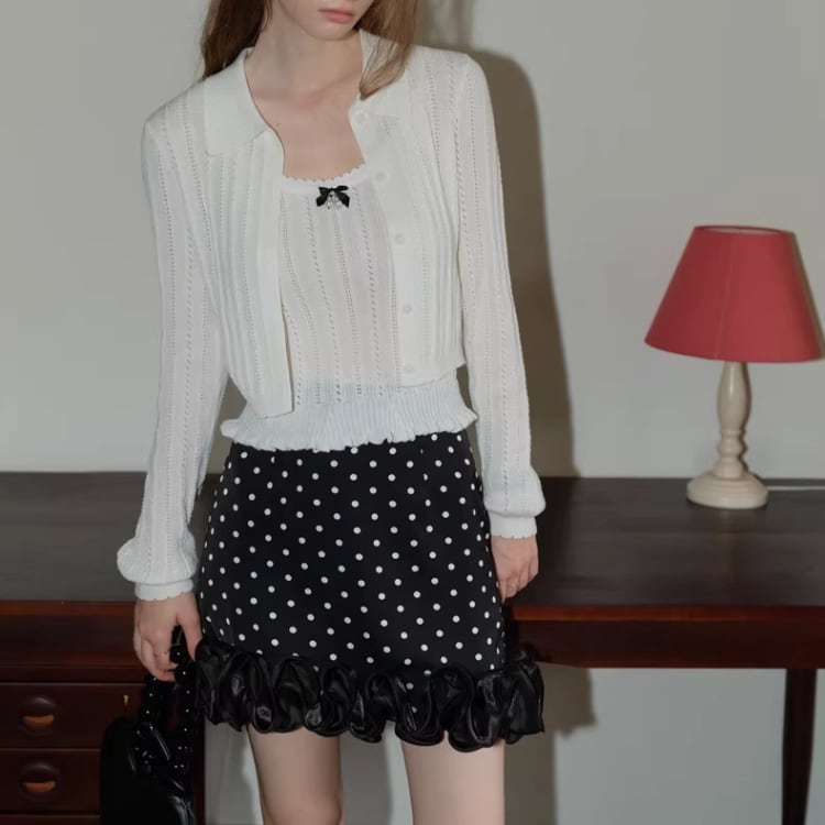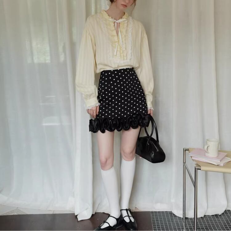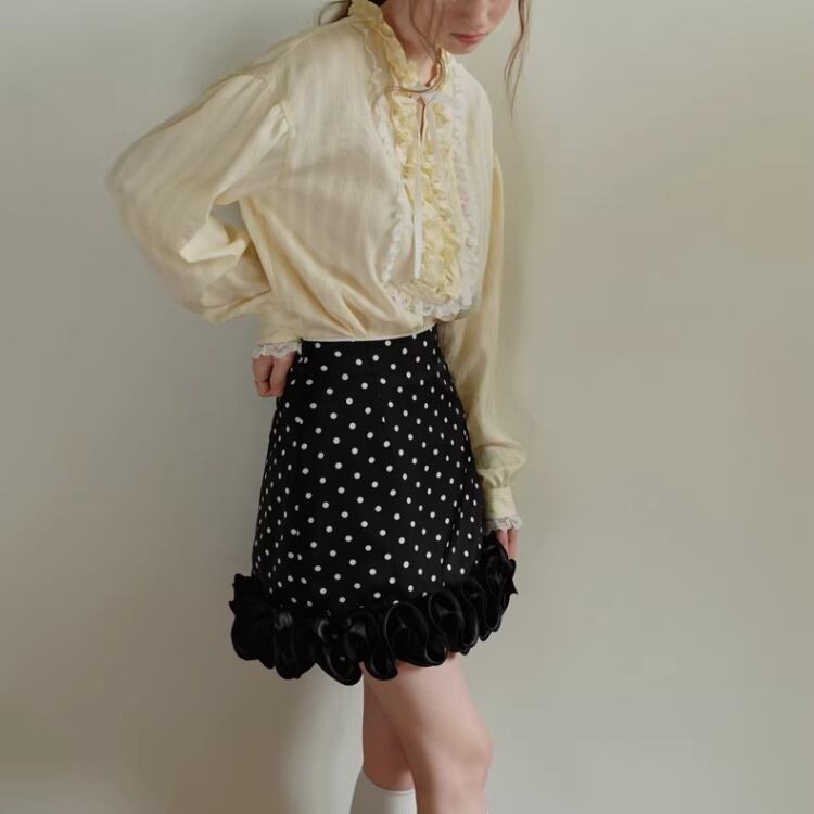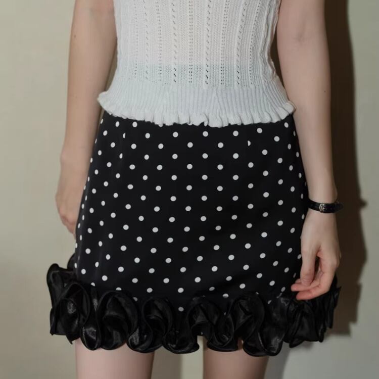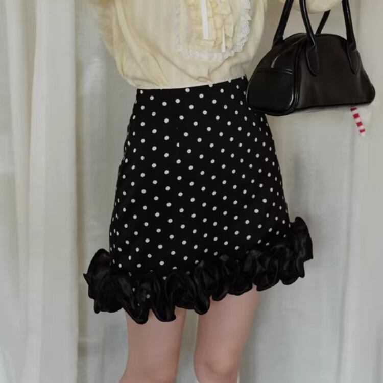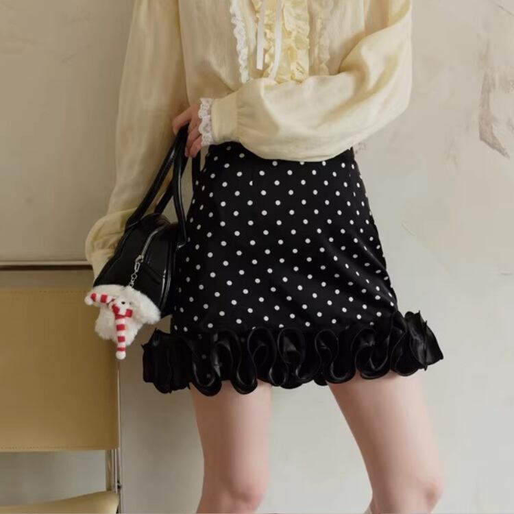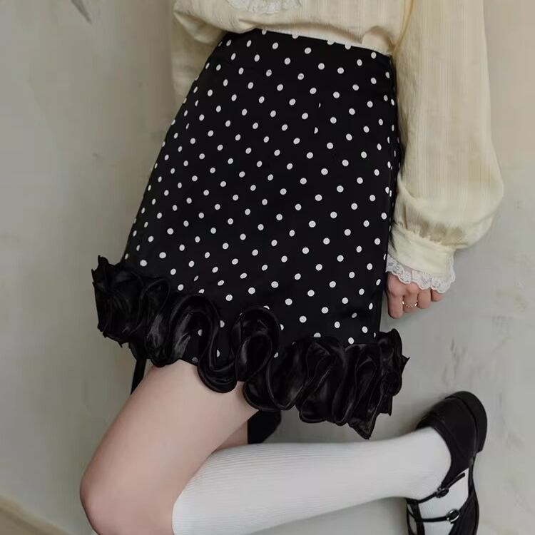 ドット柄がクラシカルな印象を与えるミニ丈タイトスカート。