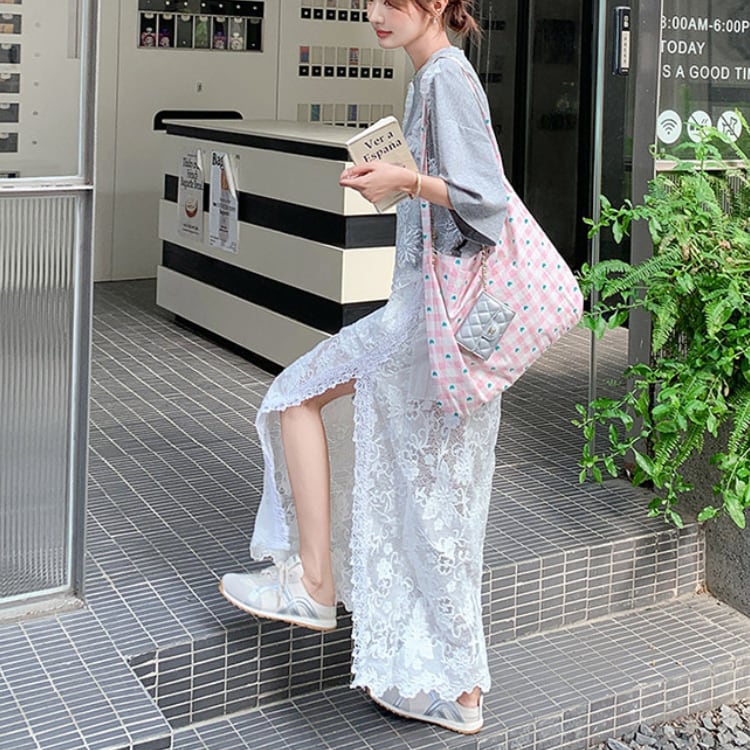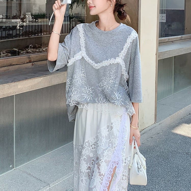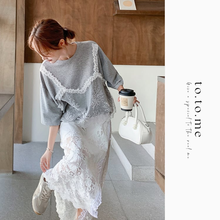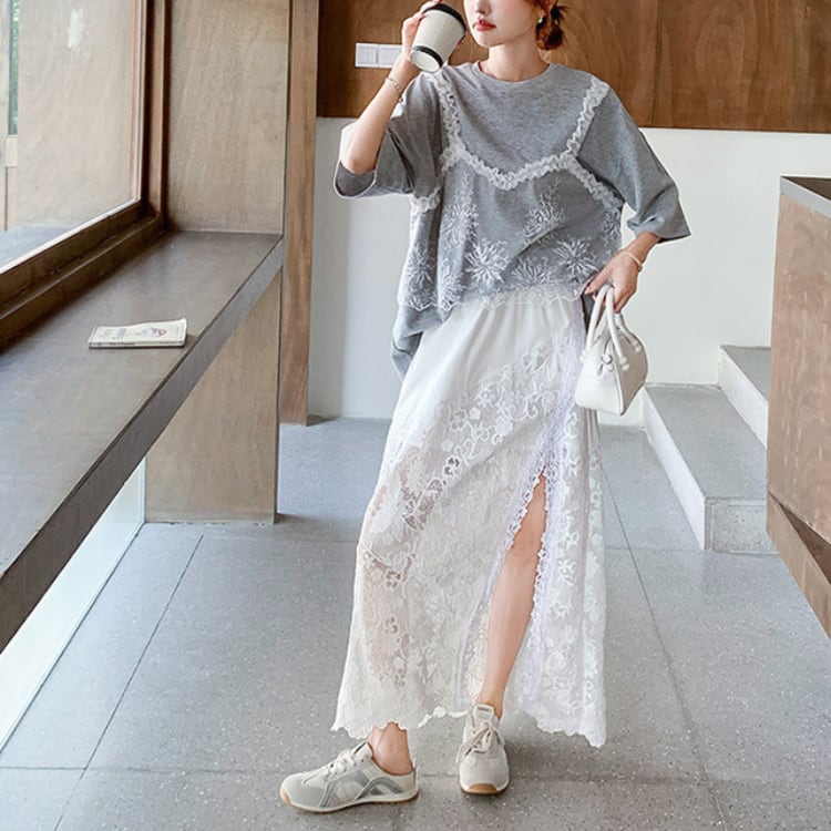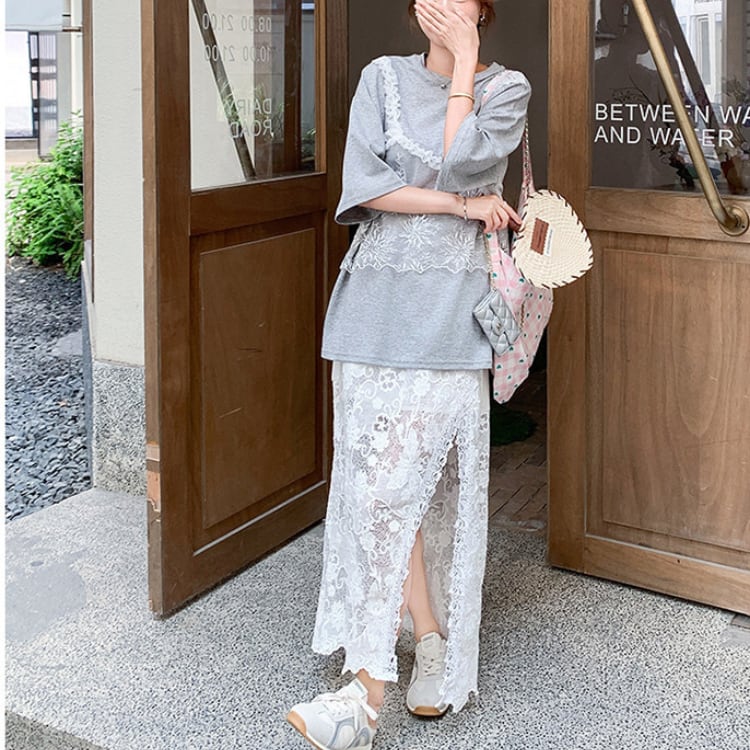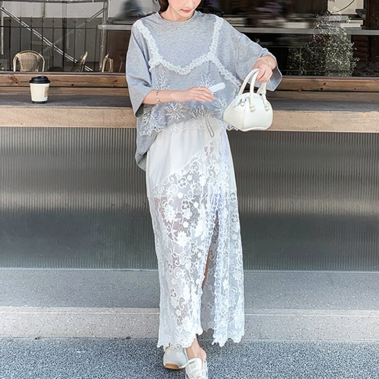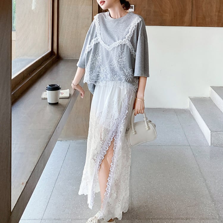 Lace layered T-shirt & lace slit skirt【2set】00343