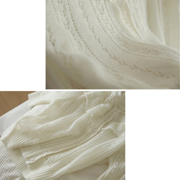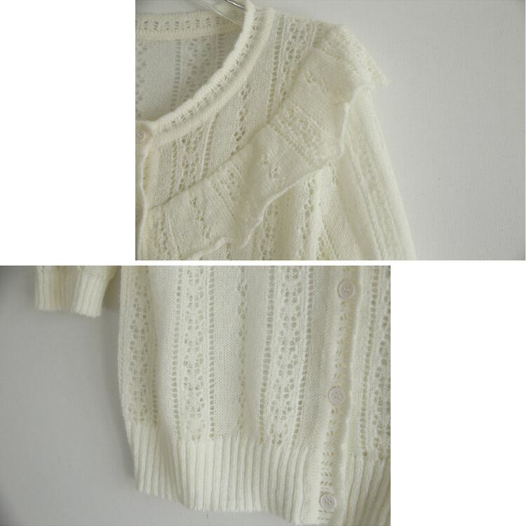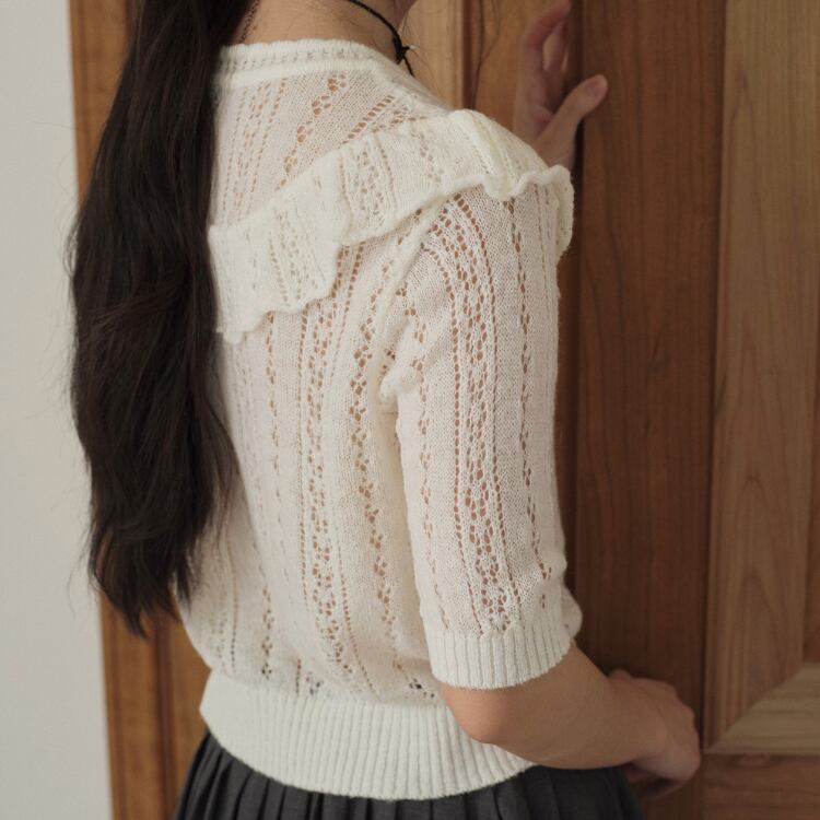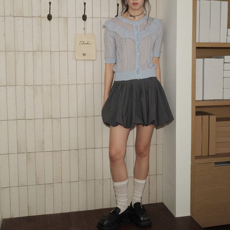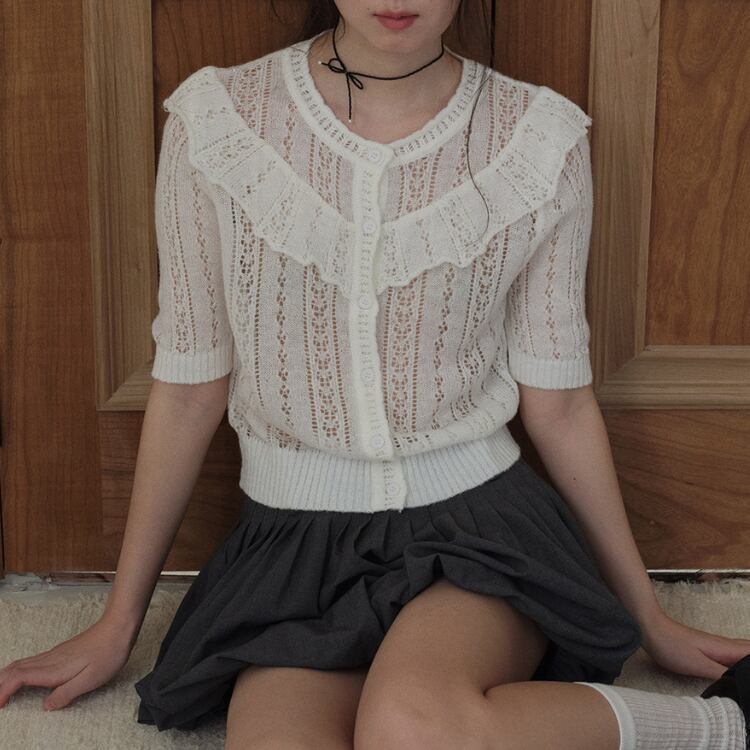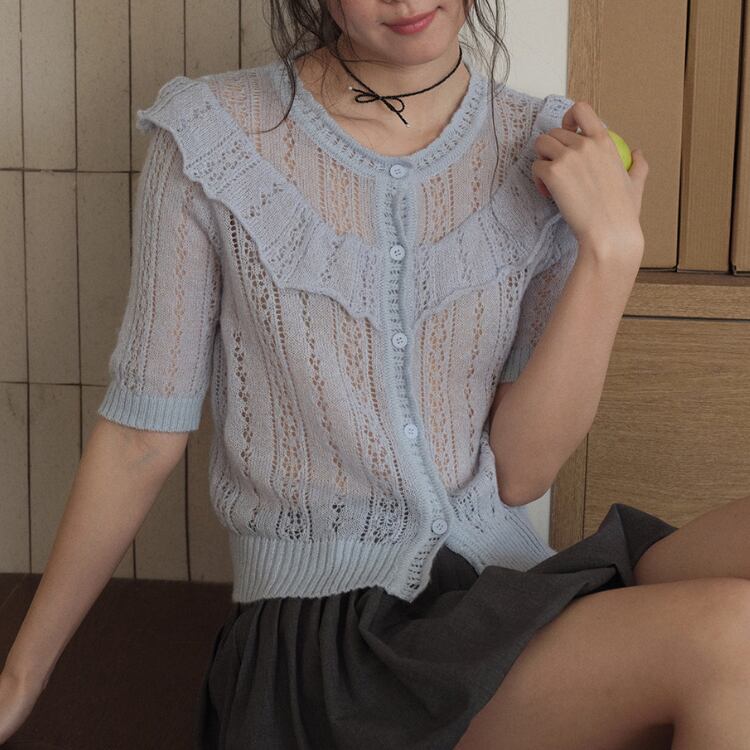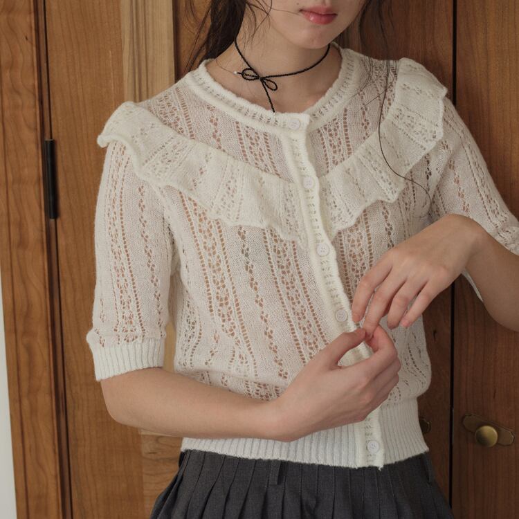 フリルデザインがフェミニンな印象をプラスする半袖カーディガン。